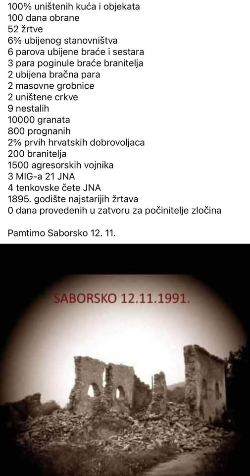 I tako, iz godine u godinu. Vijenci, svijeće, cvijeće. I bol, i presahnule suze. I sjećanje na one kojih više nema ali su zauvijek uzidani u temelje slobode Saborskog. 12. 11. 1991. godine, u mjesto su ušle četničke horde potpomognute zločinačkom JNA, porušili sve do temelja i masakrirali civilno stanovništvo.